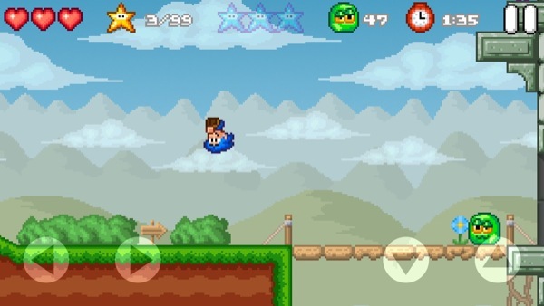 经典的触控按键式操作,在游戏中不会让你感到不适,细腻的操作体验在同类游戏中实属难得。左下角的按键可控制 Bloo 左右移动,右下角的上(下)形键是跳跃,双击则是帅气前空翻接二段跳。