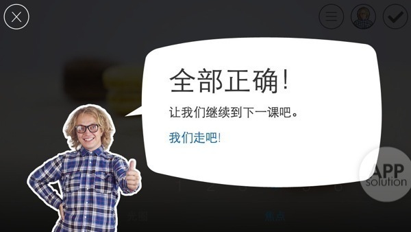 接下来是练习时间!不,不用拿出你的相机,就在你面前的屏幕上练习。老师会为你布置一个任务,比如「变更镜头的焦距,观察取景框中透视效果的变化」。这时,只需拖动屏幕下方的滑杆,即可模拟不同镜头的效果。