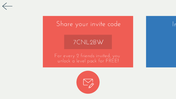 Bounsy 拥有邀请奖励机制,如果你不想花钱购买 Full 版本,只需利用「invite code」邀请好友加入游戏即可,每邀请到两位朋友便会解锁一个「level pack」。