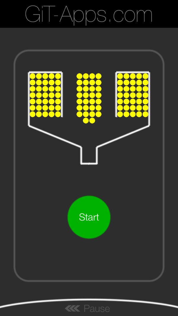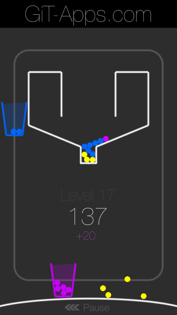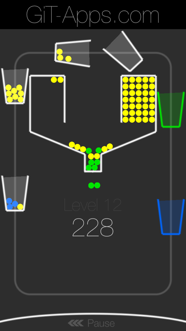 游戏玩法简单,画面中央是一个装有黄色小球的漏斗阀门,四周有着无色空杯围绕它转动,我们只需点触屏幕控制阀门开关,尽可能准确的预判其开启的时机,让小球掉落进空杯里。