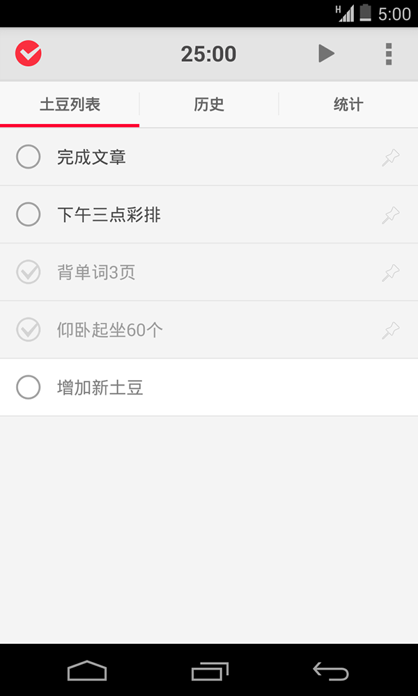 而当我们遇到了多个任务时,不用慌,在土豆列表轻松添加土豆任务,上下拖动任务进行排序,右划删除任务。完成每个土豆时只用轻击左边的圆圈就 OK 了,甚至可以点击任务右边的小标志调动番茄工作法来完成这个土豆。