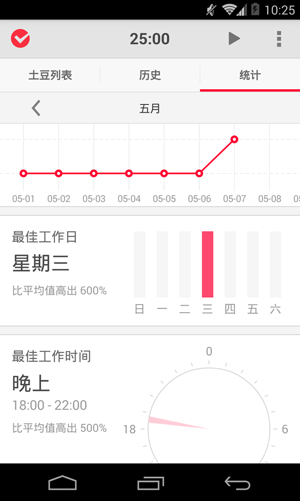 右划至「统计」板块即可查看每日的工作量,应用会根据你的工作智能推举出最佳的工作日以及每日最佳的工作时间,让你能够井井有条地安排时间,从容面对每一项任务。