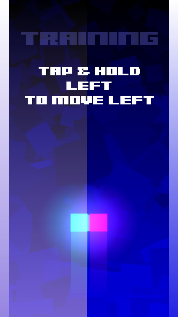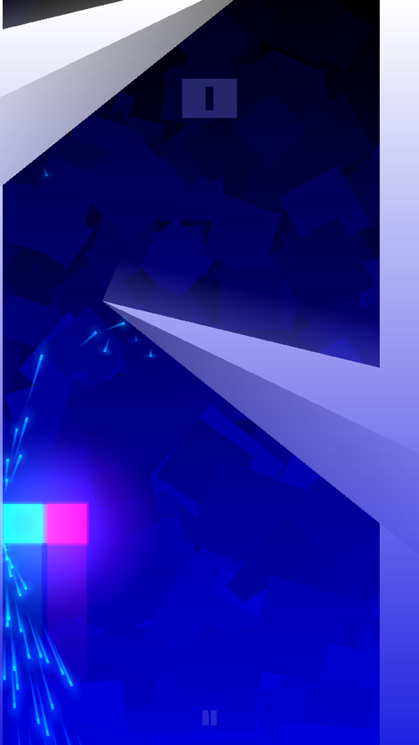 深蓝炫彩的背景下,一篮一红霓虹方块在屏幕中不断极速向上飞行,无序且不断出现棱形和尖刺障碍将阻绝它们的去路。面对障碍,我们需迅速地作出反应,点触屏幕两侧(不要拖动)让霓虹方块沿着边缘行进,绕开障碍,或是松开手指让其自行向中合拢,穿越障碍之间的空隙。