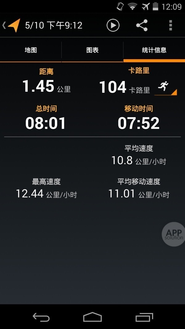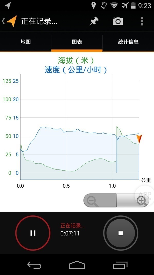 左右滑动,可以切换显示实时统计信息和速度/海拔图表。在运动的过程中,My Tracks 也会发出定时语音播报。