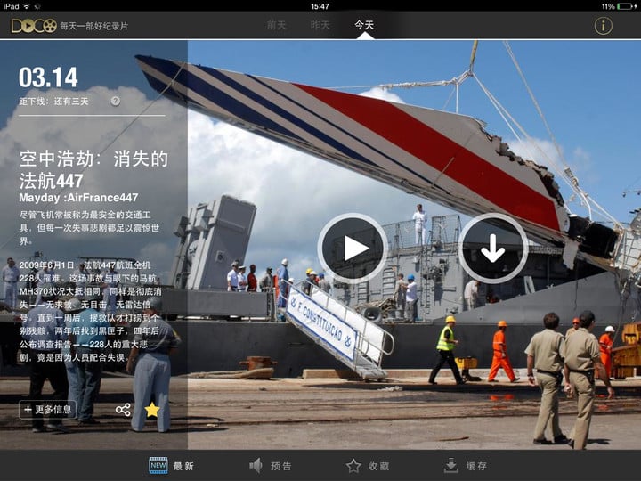 视频应用:Doco 纪录影院是最近朋友推荐的应用,喜欢看记录片的人不容错过。它每天都会推送一部优秀的纪录片,不限领域不限国别。比较特别的是,每部纪录片都有 3 天的期限,超过 3 天就会下架。为了可以随时观看,你可以选择把自己喜欢的纪录片“缓存”起来。