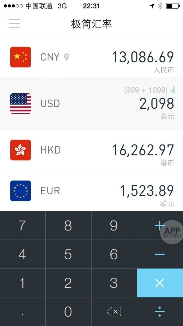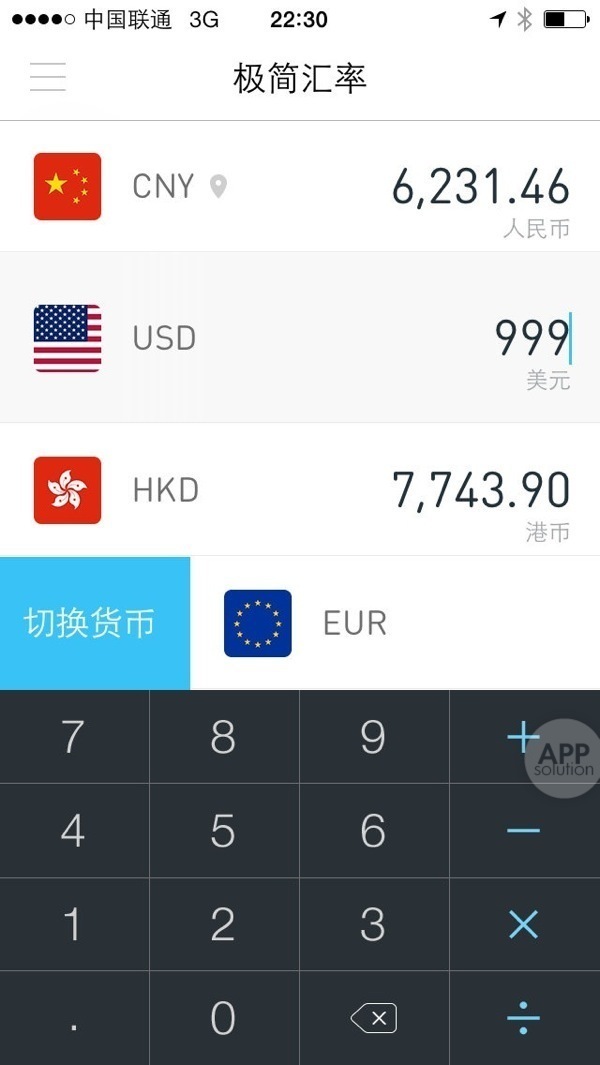 AppSo 君觉得极简汇率最好用的就是这块键盘了。加减乘除样样都有,不用在换算工具和计算器之间切来切去。而且,按住乘号和除号,应用还会自动为前面的算式加上括号,非常聪明。