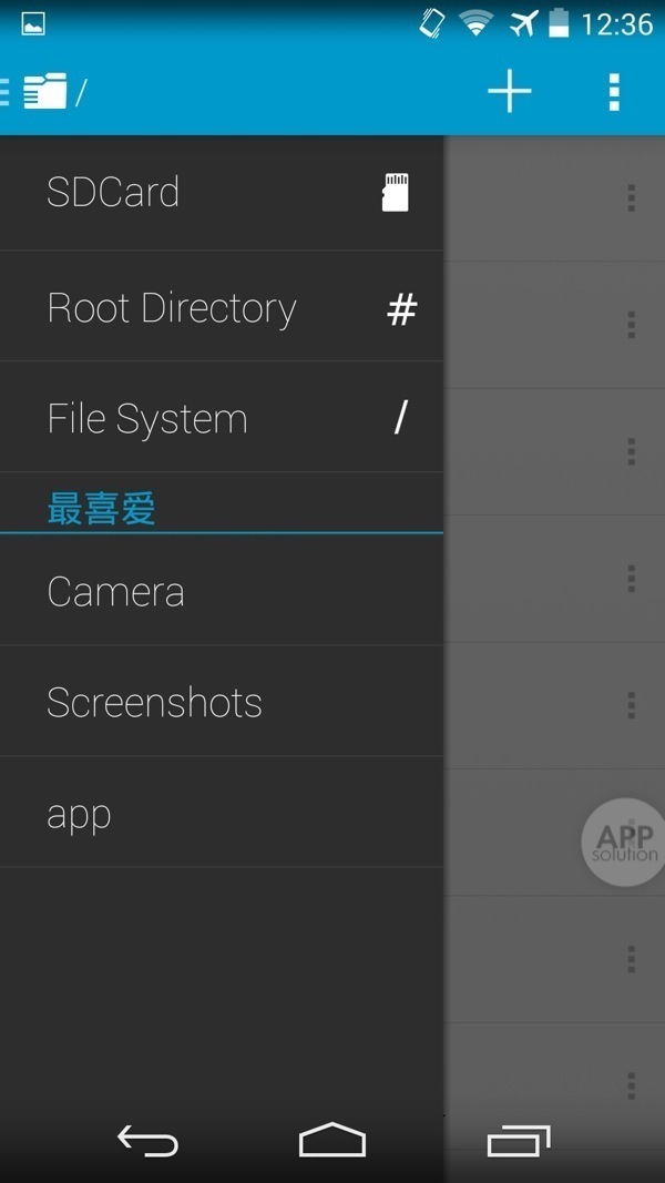 划出应用抽屉,里面有根目录、root 目录和 sd 卡目录的快捷方式。当然,你也可以将常用目录添加到收藏。