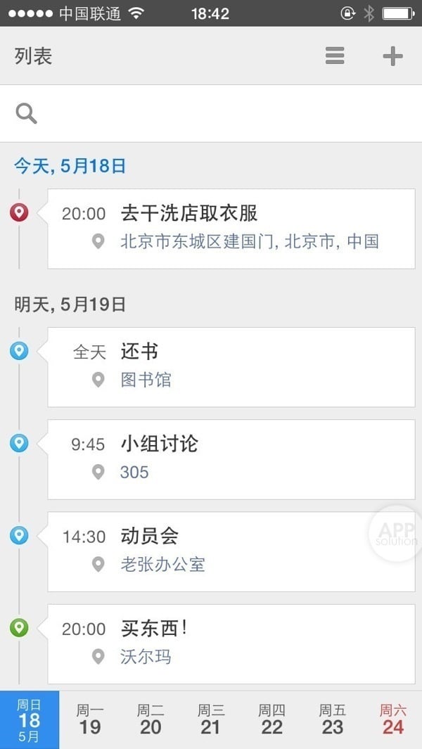 日历事件支持列表、按天、按周、按月四种显示方式,按下右上角的三道横线即可快速切换。