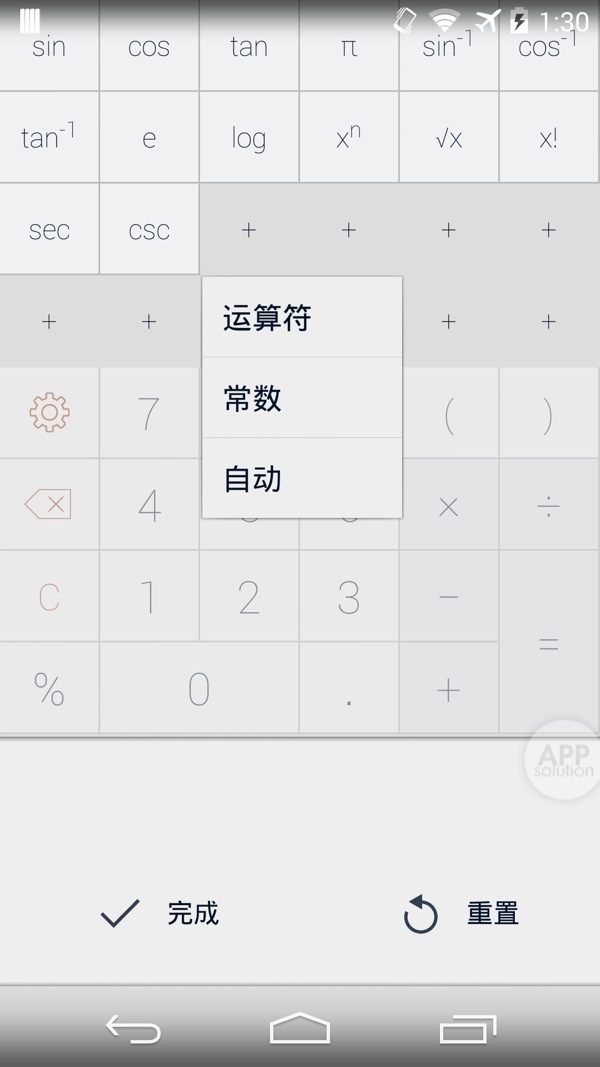 不过… 到这里还没有结束。无论你主修什么专业、从事什么工作,都能让 Calcu 为你量身定制。在 Calcu 的设置中开启全键盘模式,即可令更多运算符和常数始终显示。更妙的是,Calcu 还为你提供了十二个扩展位,你可以随意放入自己常用的运算符和自行定义的常数,省去了反复滑动和输入的烦恼。