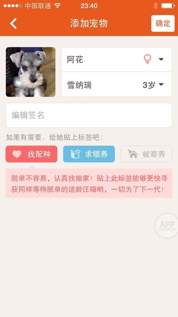 别忘了为自家的它写上个人资料呀!遛遛提供了非常非常非常全面的猫/狗品种目录,无论你家里的狗是何方神圣,在这里都能找到。同时,你还可以为它贴上标签,说明「交友目标」。
