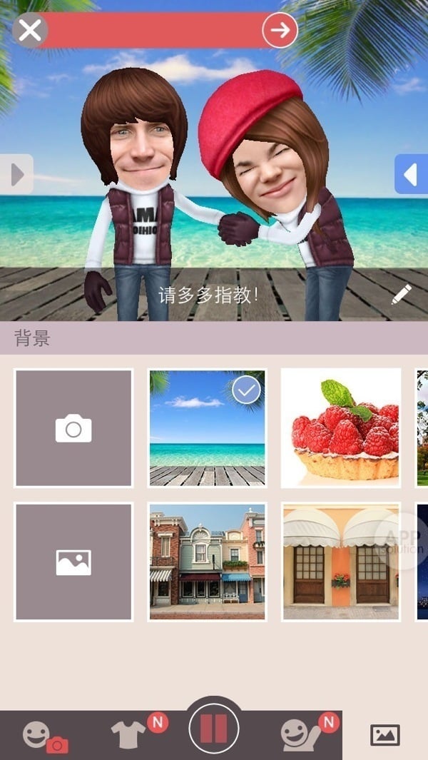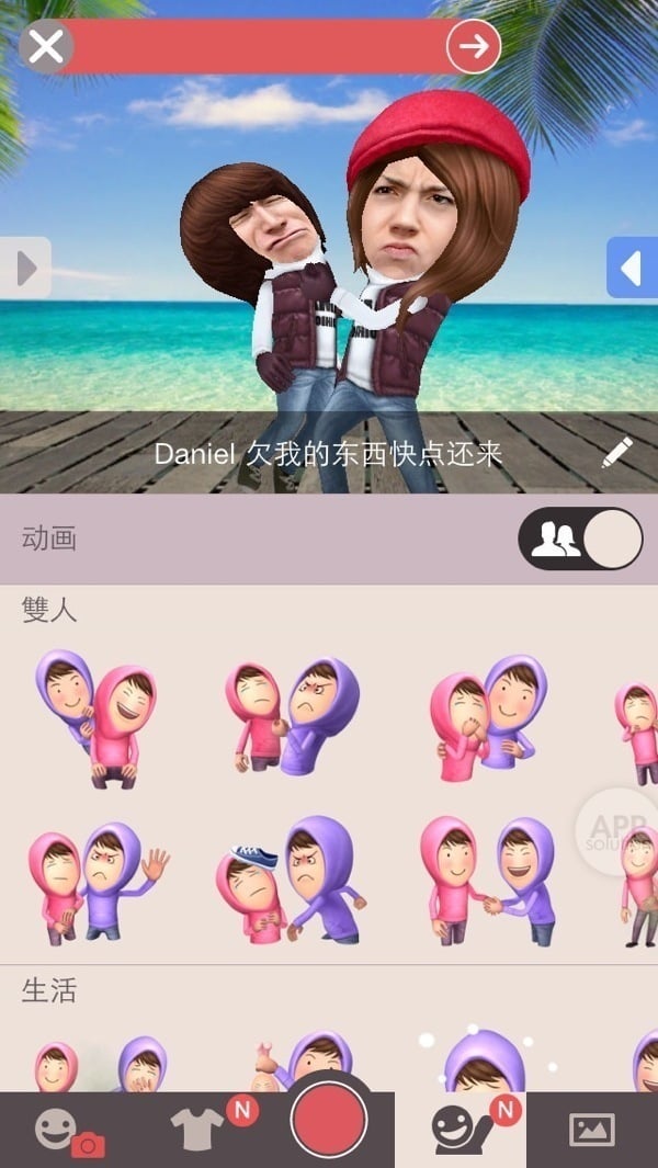 进入正题!根据你想要的效果,选出单人/双人场景,并在屏幕上实时预览。Framy 会自动生成的动画效果,并将你和朋友的脸蛋完美地融合进去,并不需要你们亲自表演哦!如果满意,就毫不犹豫地按下下方的红色按钮,将上面的效果录制下来。当然,在录制的过程中,你也可以变换场景、或是为人物换装。
