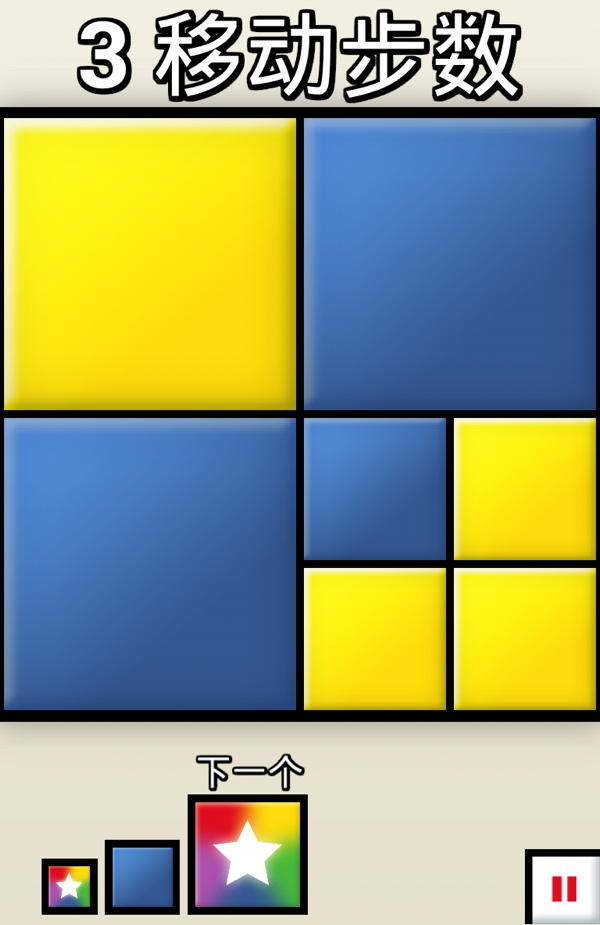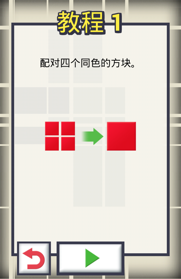游戏的目标只有一个,观察色块分布,认真思考先手色块,把四个同样颜色和大小的方块拼合在一起,组成一个大的同色方块。而把屏幕中所有同色等大方块组合成大更的方块即可通关!