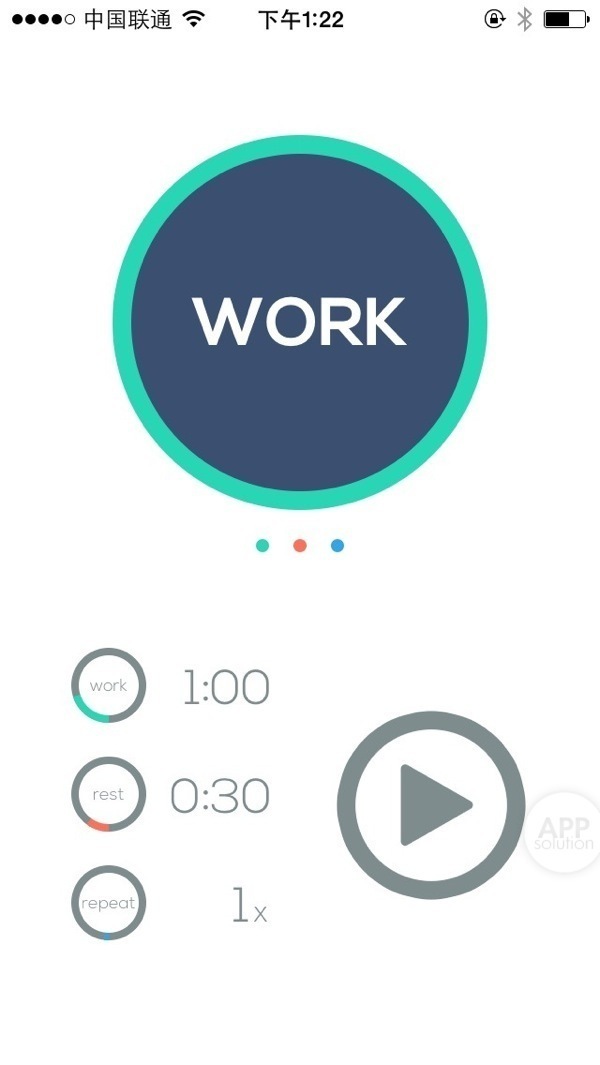 在 Timer 简洁的界面上,左下的三个小圆圈分别代表当前设置的健身、休息时间和重复次数,圆圈的右侧是开始按钮——别急,先根据你的自身状况设置一下参数吧。