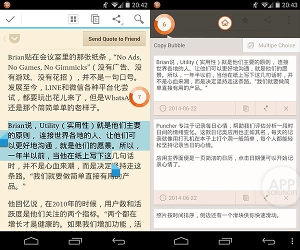这款应用的用法也十分简单。只用选中文字点击复制,内容就会存入气泡中。轻击气泡再点击任意的内容就可以开始粘贴了。
