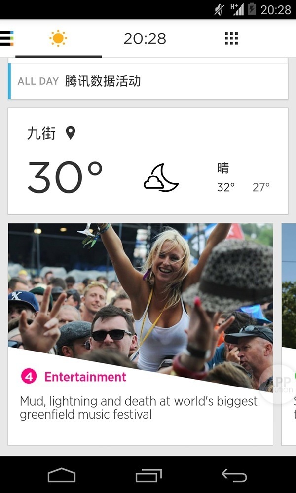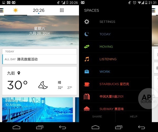 经过 Yahoo 数月的精心打磨后,Yahoo Aviate 也与雅虎高度整合。在左屏的「Today」场景中加入了之前我们推荐过的 Yahoo News Digest 新闻,依然是一天两次的推送。