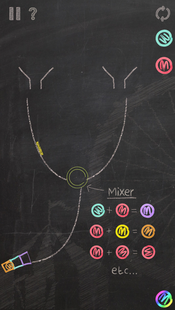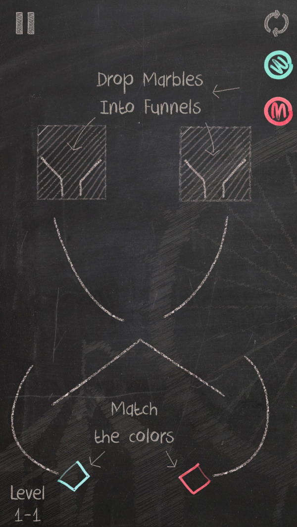 游戏的玩法简单易上手,玩家只需根据黑板上预先画出的线条路径,快速准确的估判出投放顺序,将不同颜色的「大理石」投入「漏斗」中让其滚落到指定颜色的小盒子里即可。