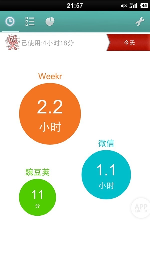 应用主界面显示了今天或最近几天使用强度最高的三款应用,看看哪款应用占用了我们最多的时间。