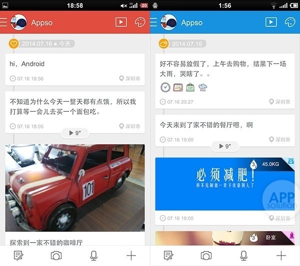 日记界面采用时间轴卡片的形式呈现,显得美观大方又便于浏览。生活手记不仅贴心地支持每日天气,还提供红、白、蓝三种颜色的主题。