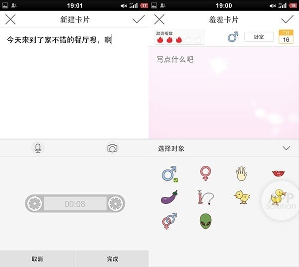记日记的方式多种多样,不仅可以文字配图,还支持语音识别,让声音也能保存下来。最新版本增加了「恋爱」、「减肥」、「羞羞」(对象还有外星人是咋回事?)三个板块,可以在专属板块中针对性地书写记录。