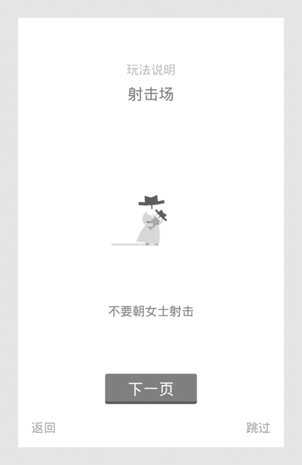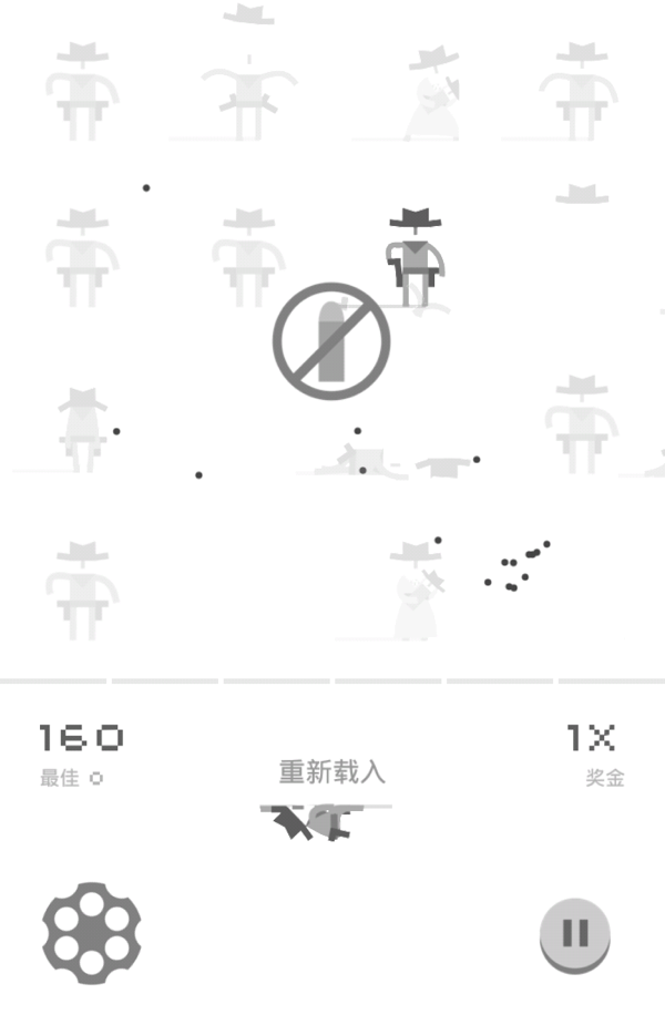 射击场:快速击倒屏幕中出现的牛仔,如果反应太慢或者忘装弹(6 发子弹,左右滑屏幕重新上弹),就会被其一枪毙命,游戏结束……