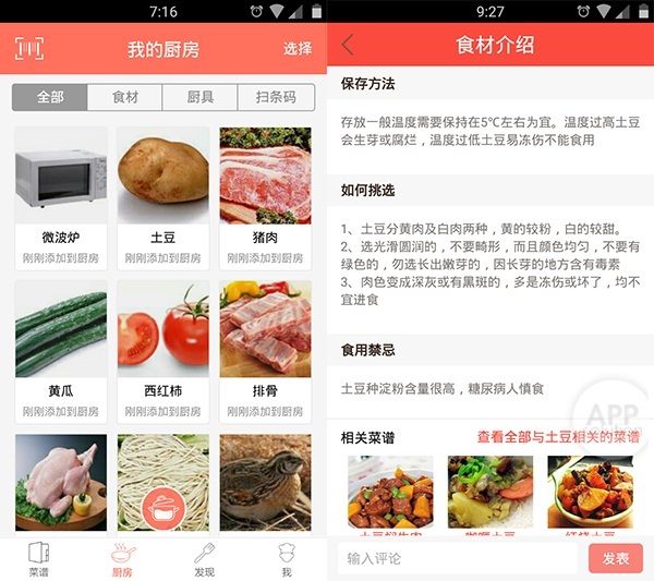 打开「我的厨房」先选择食材和厨具。点击具体的食材还能查看食用禁忌、如何挑选。