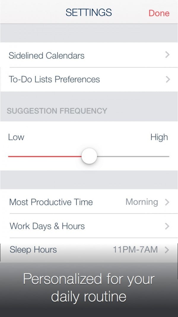 神奇的是,在使用 Timeful 一段时间之后,它会开始给你提供直观与个性的建议。每一天,Timeful 都会将你可能要列入今天的待办事项,显示在当天的日历顶部,所有事项均可快速拖动。并且在当天日历中,会根据以往的日程安排直接将它建议的事项列在其中,以助你养成良好的习惯。例如学习和夜跑,它就建议在晚上进行。