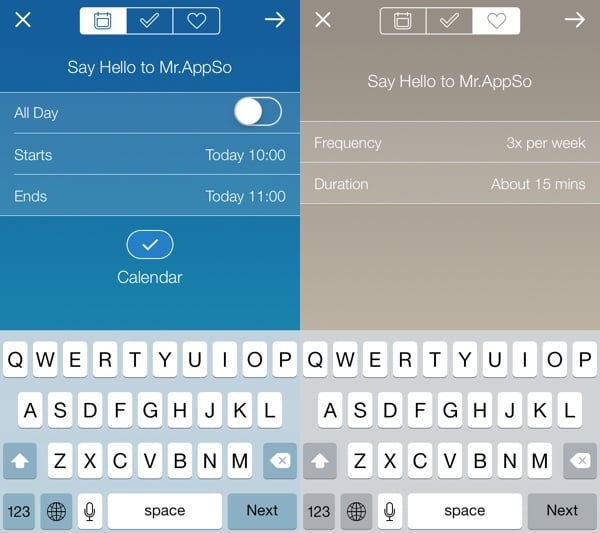 打开 Timeful,让我们先给空荡荡的日程表加点料。轻按应用程序底部的「+」号,即可添加日历、todo 或是习惯事项。Timeful 给三种类型的事项提供了不同的处理方式,比如日历事项固定在某一时间段,todo 事项可以设定由 App 来给你提供实施时间,习惯事项则自然是设定频次等等。