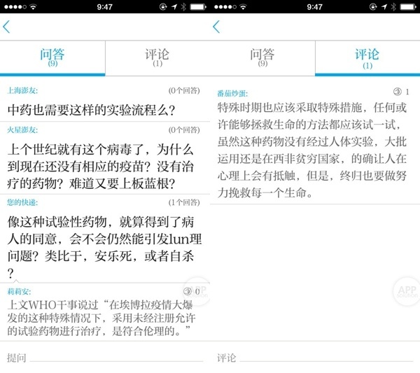 整个应用的设计是简洁有序的,向右滑拉开设置和栏目菜单,反之则可展现最新最热的问答,让你最快知道这一时刻的热门事件和关注点。