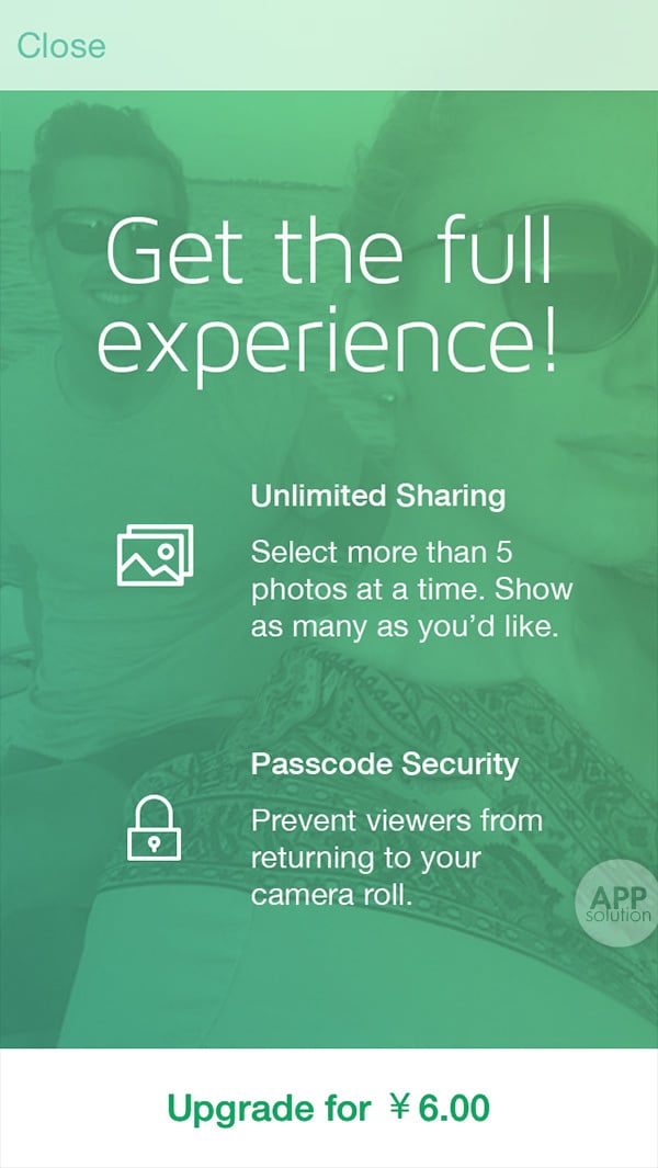 若分享的照片超过 5 张需内购,内购后还提供密码功能防止他人看完指定照片后回到你的相册。