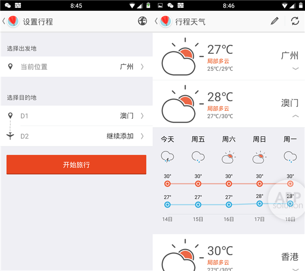 一场旅行开始前先设置好行程,之后即可方便地查询当地的天气和时间。