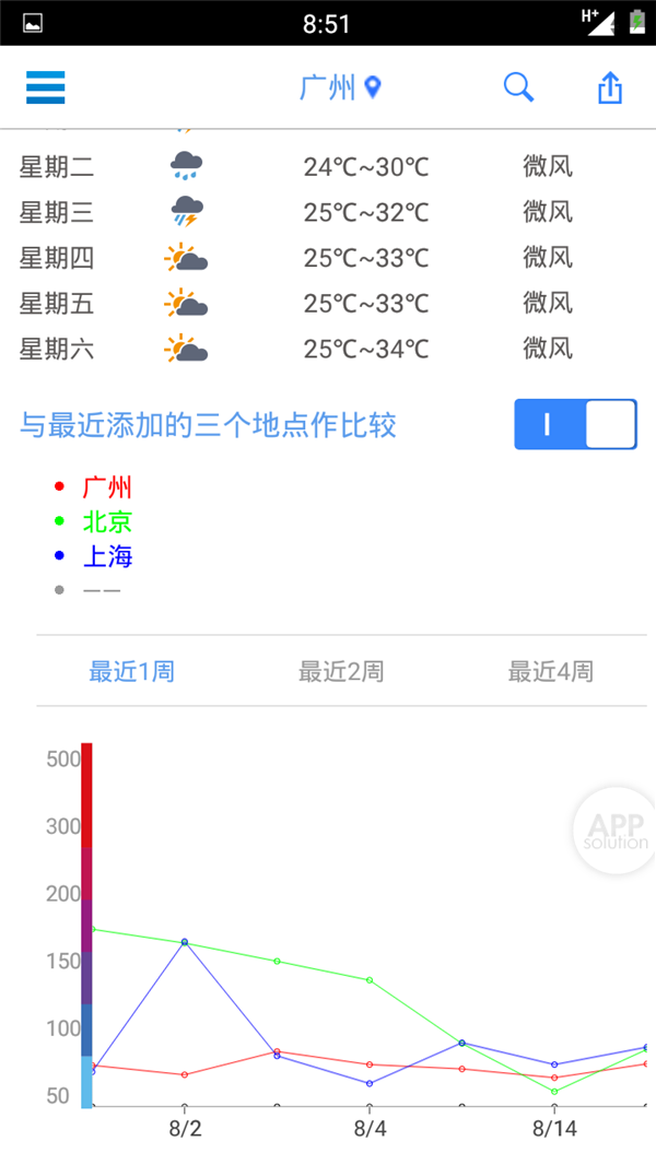 主界面向下滑动可以查看本周天气和污染程度折线图,甚至可以与最近添加的三个地点作比较,所有情况通通一目了然。