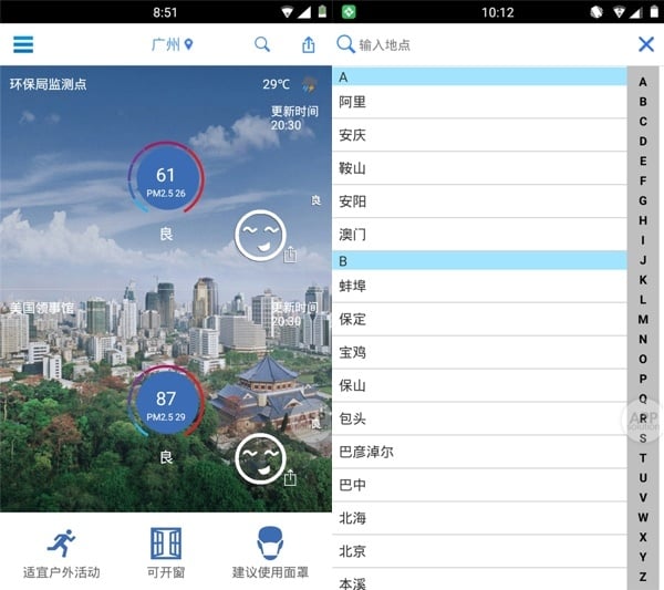 空气监测站适用于 iOS 6.0+ 的 iPhone,大小 13.6 MB;Android 2.2 + 的设备,大小 10.2 MB,完全免费。