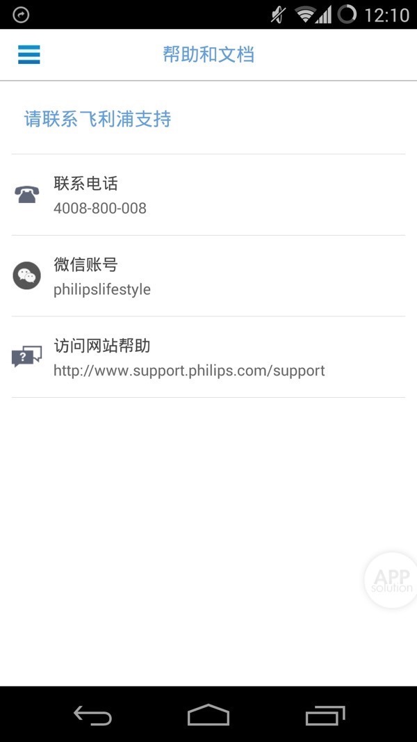 如果你遇到任何问题,也可以到「帮助与文档」里找到飞利浦官方的联系电话、微信帐号以及官方网站。
