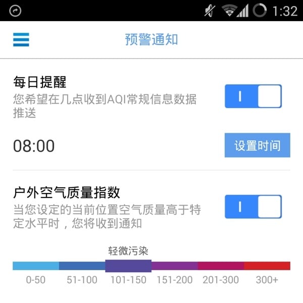 在设置中可以开启非常实用的空气质量预警功能。你可以设置每天固定时间收到 AQI 常规信息的数据推送,更可以在户外空气质量高于特定水平时,及时通知你做好防范措施。