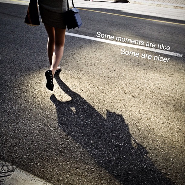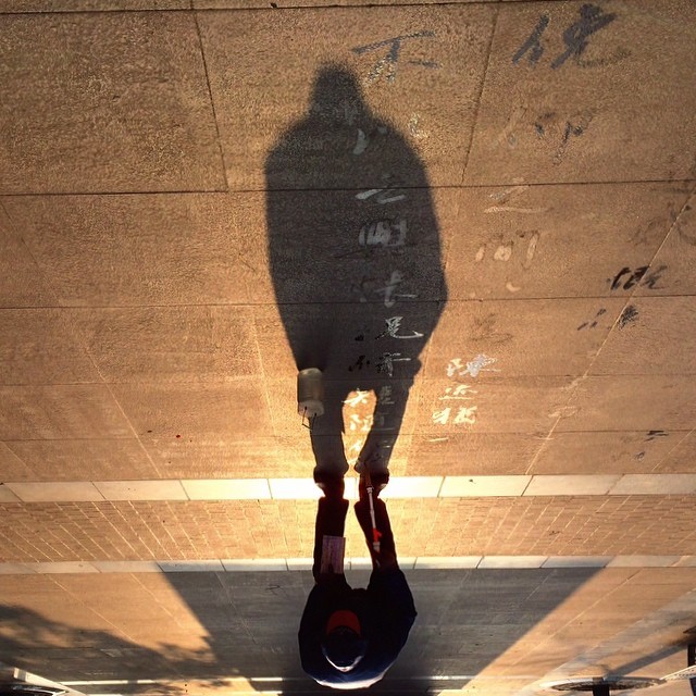 下面这张拍于 2013 年 8 月的强光天,8:30 出上海南京东路地铁时脑子还在想一张广告图片,突然看到路面上对面建筑反到路上的光线,倾斜着投入建筑的阴影里,非常像是摄影棚的光线,于是拿出手机想拍张骑行的自行车光影,刚刚好就有位女生踏入这光线,无意中就抓拍,仅此一张。