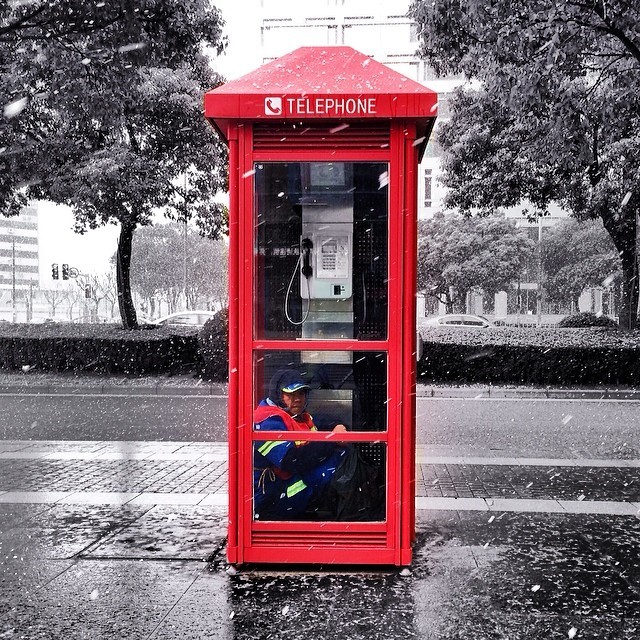 单色有非常强的突出效果。下图是拍于 2014 年 2 月上海下雪时,目前为止我收获 LIKE 最多的一张图。通过 Color Splash 的一些 App 将整体调成黑白,然后突出人、物的色彩。