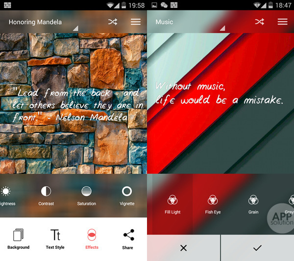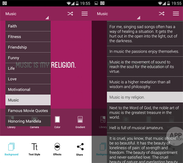 如果觉得纯色背景很单调,Kwote 还为你准备了多彩的渐变背景。如果这还是满足不了你的话,也不要担心,在自己的相册中挑选钟意的那张吧。
