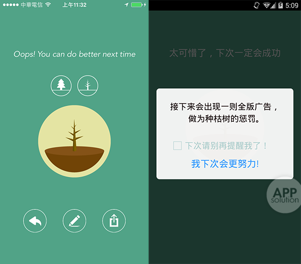 不论成功与否,都需要在结束时写下刚才所完成的事项。而一棵小树苗能否顺利长成一棵大树,全凭个人毅力。需要注意的是,Android 版本尚不支持填写任务名称,失败时也会弹出广告以示惩罚。