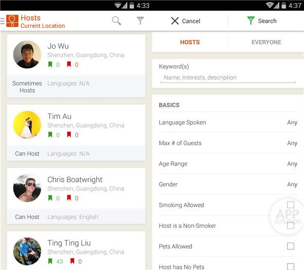 在寻找沙发主前先选择目的地。除了直接浏览概况外,还可以根据年龄、语言、是否允许抽烟、是否允许携带宠物等条件,直接过滤筛选出最合适的沙发主。