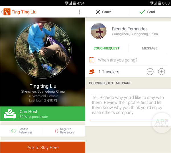 点击查看沙发主的详细资料,可以了解到的个人简介,房子的外观布局等等。确认没有问题能放心地借宿后,直接向对方发送申请即可。