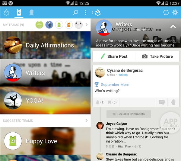 这是一个互相激励的社区应用,在这里你可以快速找到自己感兴趣的群组,与小伙伴一起交流分享实践心得,互相监督一起努力。相比之前推荐的 youdare,这款应用不要求一定要做出有创意或者让人印象深刻的事情,而是着眼于每日细微的坚持,一点一滴地改善生活。