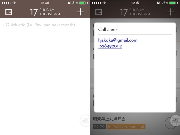 简洁的界面让你更加专注于 reminder 本身。点击右上角 + 号就可添加新的 reminder ,还可以设置提醒时间、重复提醒和添加 notes ,在 notes 界面填写电话号码或者邮件地址的话可以直接点击打电话或者发邮件,非常方便,相信这个功能会深受商务人士的喜欢。