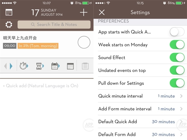 等等,是不是发现有些不一样的地方?check 圆圈跑到左边来了。请不要惊讶,更不要认为这是个 Bug。这其实是设置中的 Left Handed 选项,为左手使用习惯者专设的功能。不禁为开发者的人性化设计点赞!真的是太体贴了,用户体验立马提升一个档次。