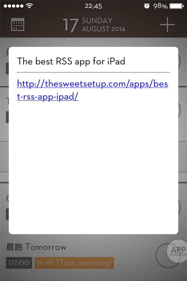 - 利用 iOS 自带 Safari 书签 ,将当前网页标题和链接分别发送到 Beja 的 event 和 notes 部分来设置提醒稍后阅读,然后自动返回到 Safari 当前网页。想要实现此功能只要将此链接 javascript:location.href=’beja://x-callback-url/add?event=’+encodeURIComponent(document.title)+’¬e=’+encodeURIComponent(location.href)+’&x-success=’+encodeURIComponent(location.href); 保存为 Safari 书签即可。感兴趣的朋友可以试下这个神奇的链接。