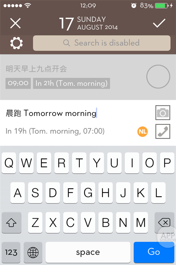 其实这个就是 Beja 所支持的自然语言功能。虽然目前不支持中文,但可利用中英混输来达到使用这个功能的目的。比如还可以在中文后输入 tomorrow morning,tonight 等,只是会自动设置成相应的默认提醒时间,7:00 和 21:00。(注:时间之前需加空格,否则无法识别。)