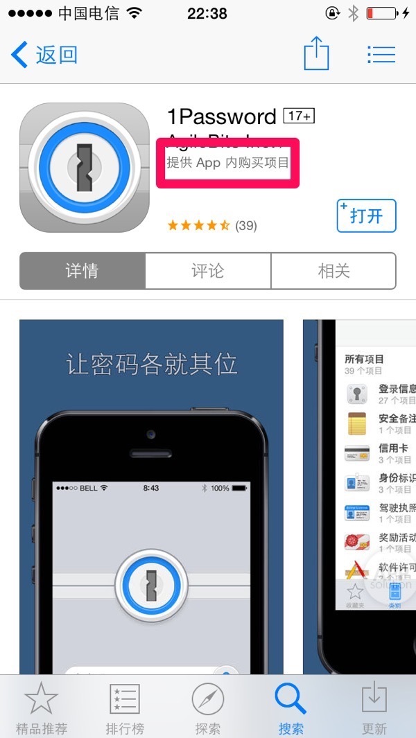 最后,我们注意到 1Password 现在在 App Store 显示「提供内购项目」,尚不清楚这个内购项目是什么,也不知道 1Password 的开发商在打什么算盘。据测试,目前下载到的免费版 1Password 并没有什么功能缺失,猜测有可能是跟 iOS 8 相关的插件功能会通过 IAP 形式收费。另外,已经付费的用户也无需郁闷,开发商已承诺老用户可以免费升级。