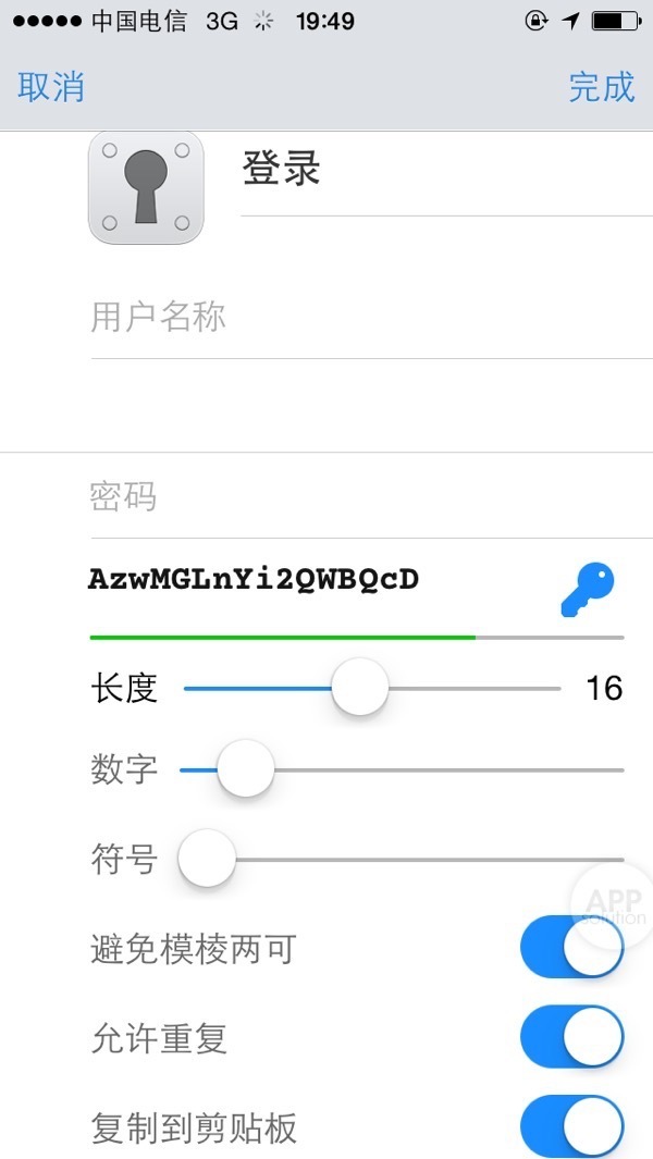 填好标题、登录名和网站等字段后,注意密码区的「钥匙」按钮——如果你希望修改该网站的密码,可以通过这个按钮来随机生成一个高安全度的密码,再用这个密码去对应的网站将原来的密码修改掉。