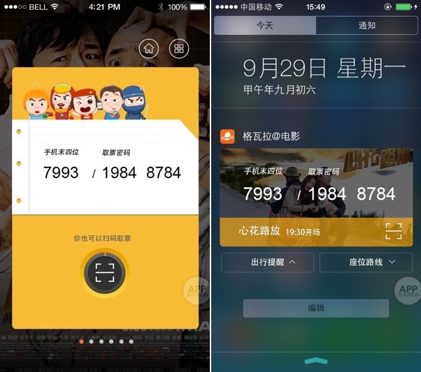 更酷的是,格瓦拉的 iOS 8 插件会跟全新的观影小伙伴进行联动。全新的观影小伙伴着重强调了「场景感」——买票后?出发前?取票时?电影开场?看完电影?——这些场景在不仅在 app 内都有对应颜色的卡片,而且还能实时显示在通知中心的插件里。