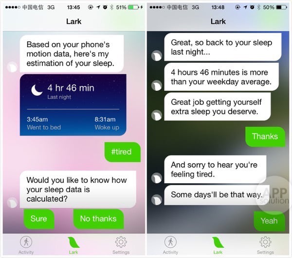 Lark 可以用来跟踪你的睡眠和运动状况,量化这些信息来帮助你更好地调节生活习惯。每次打开 Lark,它都会向你问候,并根据你之前运动所产生数据来提供相应的反馈。