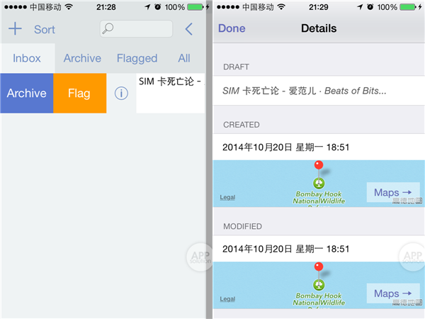 如果将带有地理位置信息的草稿发送到印象笔记的话,地理位置信息也会一同保存在笔记中的。另外还可根据草稿创建和修改的时间对其进行排序。